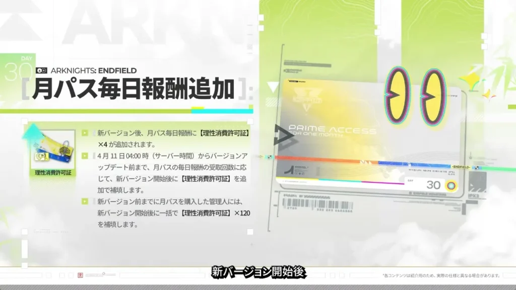 ▼// 新バージョン開始後、すべての管理人に「新・月パス」をプレゼント!#エンドフィールド pic.twitter.com/9gSVKXapme
